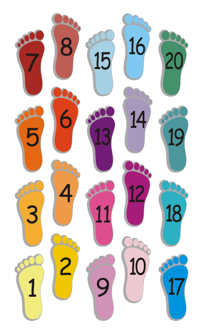 Naklejki w kształcie stópek są umieszczane na podłodze w różnych miejscach w klasie lub na korytarzu. Każda stópka reprezentuje jedną cyferkę. Dzieci mogą poruszać się od jednej stópki do drugiej, ucząc się cyferek poprzez ruch. To doskonały sposób na połączenie nauki z aktywnością fizyczną!