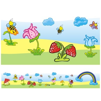 Zamiast zwykłych pojedynczych naklejek możesz użyć gotowych pasków dekoracyjnych. Taki pasek z łąką wzbogacony został o tęczę, kwiatki, chmurki, truskawki, gąsienicę, biedronkę, pszczółki i motylki. Świetna naklejka do pokoju dziecięcego!