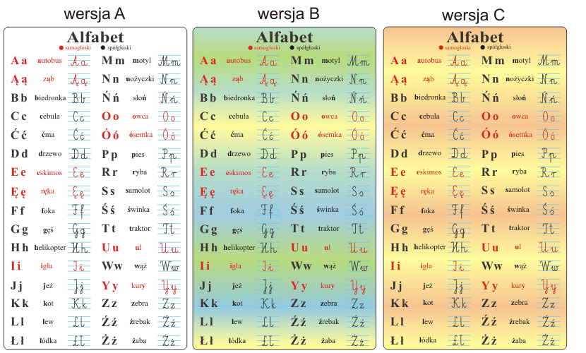 1. Naklejka na ścianę z alfabetem zawiera wszyskie litery polskie z podziałem na samogłoski i spółgłoski. Cena zależna jest od wymiaru. Standardowo jest to biała naklejka z czarnymi i niebieskimi literami czyli wersja A. Jeśli chcesz wersję B lub C napisz to w polu UWAGI przy składaniu zamówienia.
