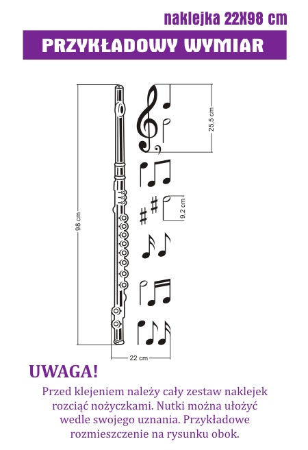 Naklejka na ścianę flet poprzeczny występuje w komplecie łącznie z nutkami, kluczami i krzyżykami, których jest aż 16 sztuk. Cena obejmuje cały komplet.