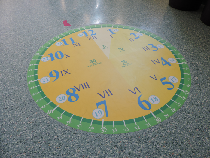 Naklejka podłogowa zegar to świetne uzupełnienie materiałów dydaktycznych w edukacji wczesnoszkolnej. Zegar jest dwudziestoczterogodzinny z dodatkowymi cyframi rzymskimi. Dla ułatwienia i zrozumienia jego działania, tarcza została podzielona na cztery części, w których poszczególne wycinki oznaczają odpowiednio: 5, 10, 15 i 30 minut.
