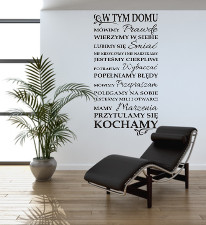 Welurowa naklejka z napisami w której znajdziesz takie zwroty jak: lubimy się śmiać, jesteśmy cierpliwi, polegamy na sobie, przytulamy się to idealna dekoracja do pokoju dziennego. Znajdź dla niej wyjątkowe miejsce na ścianie i ciesz się nowa dekoracją.