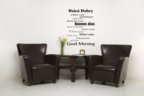 Naklejka z napisami Dzień dobry, buenos dias, good morning ... to propozycja do nowoczesnego wnętrza. Umieść napisy na korytarzu lub w jadalni i zobacz jak łatwo odmienić wnętrze.
