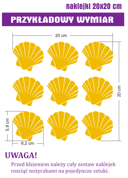 Na rysunku wyżej tuż nad OPISEM PRODUKTU jest mały obrazek przedstawiający wymiary małych muszelek dla całego zestawu 20x20 cm.