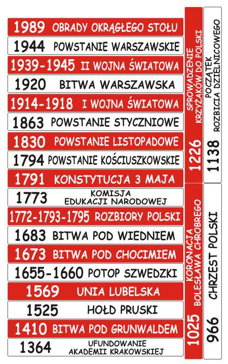 Zestaw naklejek historycznych składa się z 22 sztuk, począwszy od 966 roku Chrztu Polski aż do 1989 roku Obrady Okrągłego Stołu. Występuje w kolorze biało-czerwonym, symbolizującym kolejno czystość i odwagę.