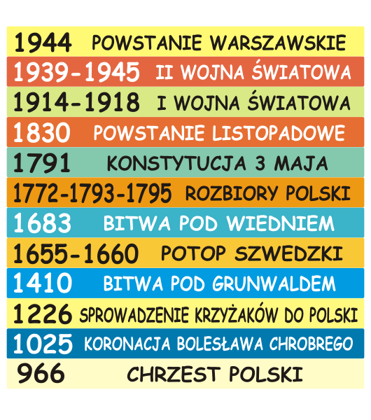 1. W zestawie edukacyjnym historycznym znajduje się 12 prostokątnych naklejek z lekko zaokrąglonymi rogami. Każda nalepka ma wymiar 100 cm długości na 10 cm wysokości lub 120x10 cm lub 128 cm na 10 cm.