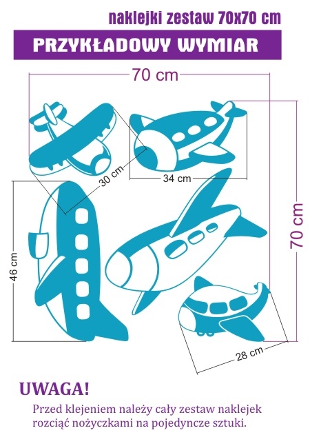 4. W zależności od tego, ile masz miejsca w pomieszczeniu i jaką dysponujesz powierzchnią, wybierz najbardziej odpowiadający Ci wymiar z samolotami. Im większa naklejka, tym cena jest wyższa. Naklejkę możesz zamontować na każdej płaskiej, suchej i czystej powierzchni, typu: ściana, meble, szkło, okno, drzwi, lodówka, biurko, laptop, lustro, szafa z płyty MDF, itp.