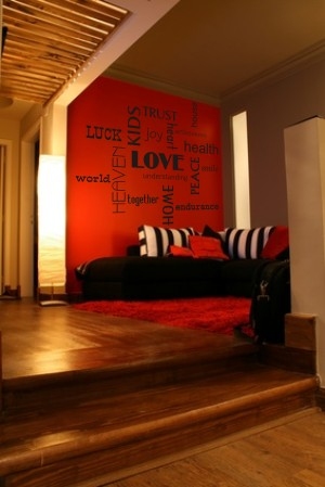 Napisy po angielsku: love, luck, home, house, together to tylko niektóre wyrazy z całej naszej wyjątkowej naklejki ściennej. Możesz użyć ich w całości lub pociąć na części i ułożyć wedle swego upodobania, w salonie, przedpokoju czy dużej sypialni.