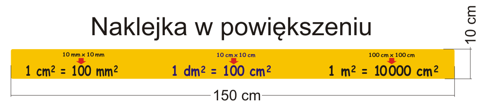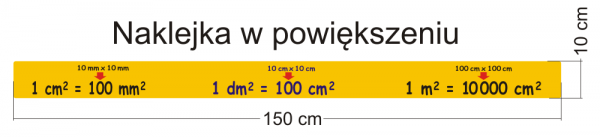 1. W zestawie znajduje się 9 prostokątnych naklejek z zaokrąglonymi rogami. Każda naklejka ma wymiar 150 cm długości na 10 cm wysokości. Cały arkusz ma wymiar 150x92 cm. Znajdziesz tu przeróżne jednostki miary, np. centymetry, metry, kilogramy, litry, itp. z dodatkowymi tłumaczeniami i odnośnikami w metrach kwadratowych i sześciennych.