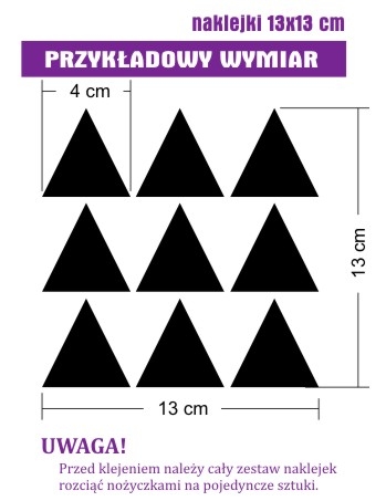 4. W zależności od tego, ile masz miejsca w pomieszczeniu i jaką dysponujesz powierzchnią, wybierz najbardziej odpowiadający Ci wymiar trójkątów. Im większa naklejka, tym cena jest wyższa. Naklejkę możesz zamontować na każdej płaskiej, suchej i czystej powierzchni, typu: ściana, meble, szkło, okno, drzwi, lodówka, biurko, laptop, lustro, szafa z płyty MDF, itp.