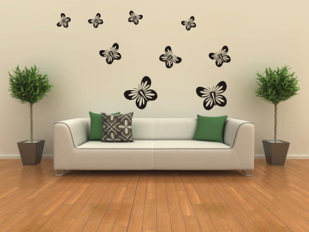 Zestaw składa się z 9 motylków o różnej wielkości. Każdego motylka można dowolnie umieścić na ścianie, szafie, drzwiach, na każdej płaskiej powierzchni.