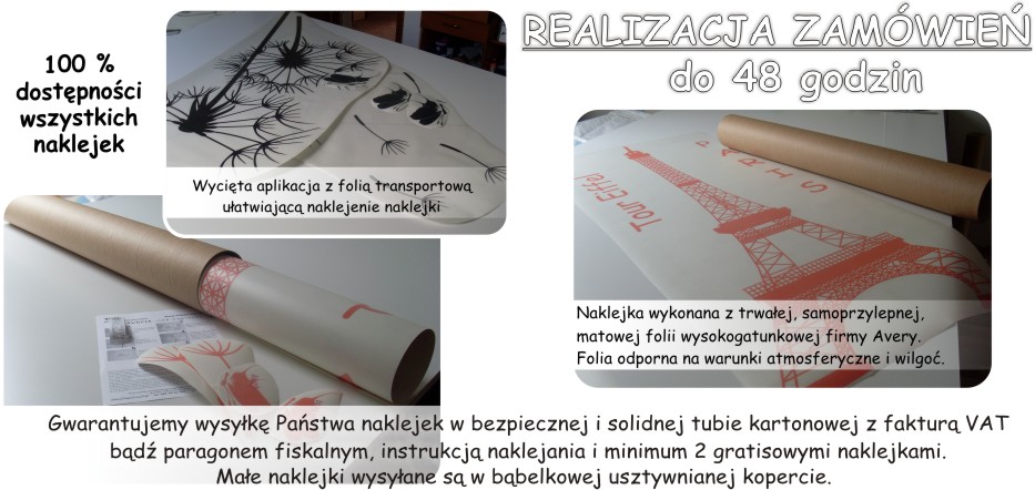 | Sposób zapakowania | - prostokątna tuba tekturowa dla naklejek większych, małe naklejki - usztywniana bąbelkowa koperta. |