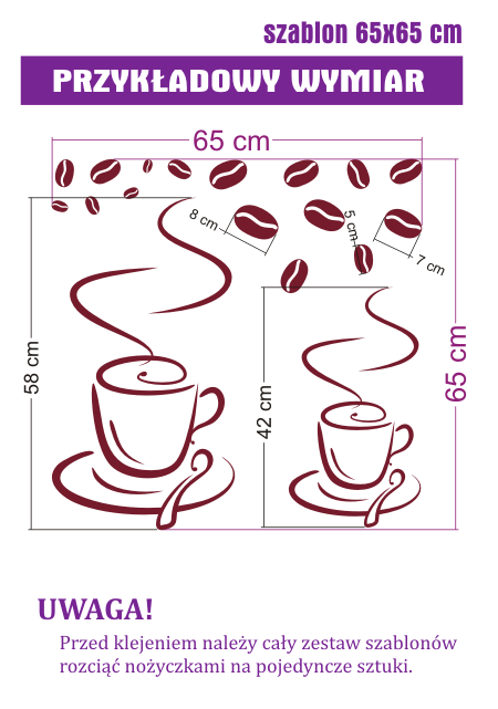 3. W zależności od tego, ile masz miejsca w pomieszczeniu i jaką dysponujesz powierzchnią, wybierz najbardziej odpowiadający Ci wymiar filiżanek do kawy. Im większy wzór, tym cena jest wyższa. Szablon możesz zamontować na każdej płaskiej, suchej i czystej powierzchni, typu: ściana, meble, okno, drzwi, lodówka, biurko, szafa z płyty MDF, itp. Można wypełnić go farbą lub tynkiem w różnych kolorach.