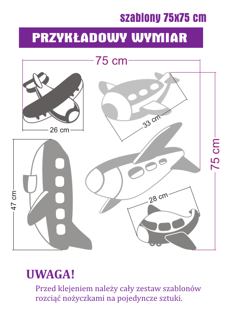 3. W zależności od tego, ile masz miejsca w pomieszczeniu i jaką dysponujesz powierzchnią, wybierz najbardziej odpowiadający Ci wymiar samolotów. Im większy wzór, tym cena jest wyższa. Szablon możesz zamontować na każdej płaskiej, suchej i czystej powierzchni, typu: ściana, meble, okno, drzwi, lodówka, biurko, szafa z płyty MDF, itp. Można wypełnić go farbą lub tynkiem w różnych kolorach.