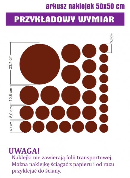 5. W zależności od tego, ile masz miejsca i jaką dysponujesz wolną powierzchnią, wybierz najbardziej odpowiadający Ci wymiar kropek. Im większy wzór weluru, tym cena jest wyższa. Nalepki możesz zamontować na każdej płaskiej, suchej i czystej powierzchni, typu: ściana, meble, okno, drzwi, lodówka, biurko, szafa z płyty MDF, laptop, itp.